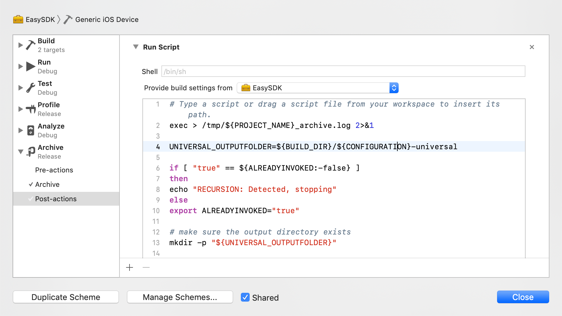 To have Xcode run the script after archiving automatically, select the EasySDK target, click Product -> Scheme -> Edit Scheme (or Cmd + Shift + <), and configure a Run Script post-action for the Archive command: